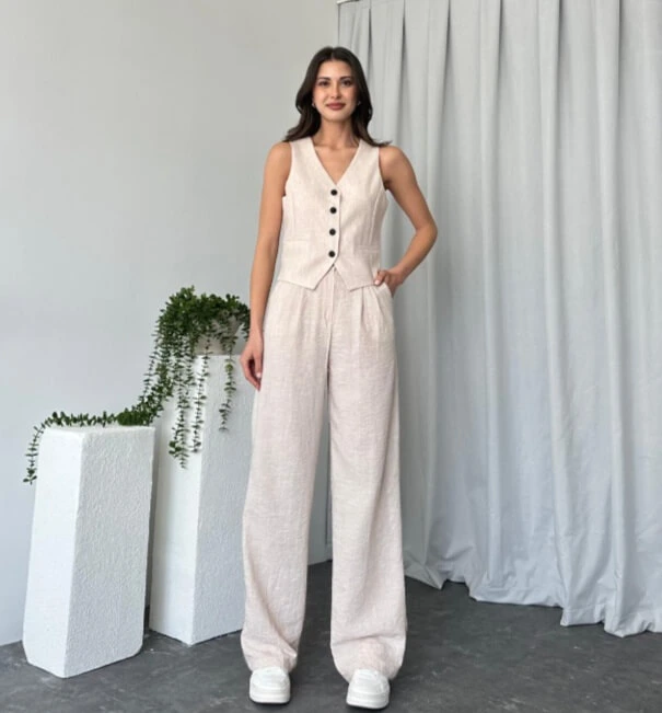 Veramuu farkı ve kalitesiyle üretmiş olduğumuz tüm kadın yelekli takım ürünlerimizde olduğu gibi kadın Alex taş rengi takım modelimiz de tam beden ölçü kalıplarıyla hazırlanmaktadırlar. Bu modelimiz geniş paça pantolona sahip bir kadın ikili takım modeli olmaktadır. Pantolon beli yüksek belli olup, yelek boyu bel hizasına kadar uzanmaktadır.