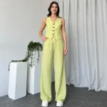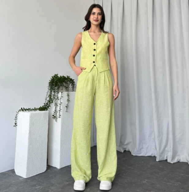 Veramuu farkıyla ve kalitesiyle üretmiş olduğumuz kadın Alex yeşil takım modelimiz birbirinden canlı renk seçenekleri ile hizmetinizde! Yüksek belli geniş paça pantolon modeline sahip olan bu kadın yelekli takım modelimizin yelek kısmı ise bel hizasında bitmektedir. Böylece giydiğiniz an vücudunuzda kusursuz duracak olan bu kadın ikili takım sayesinde tüm gözler üzerinizde olacak!