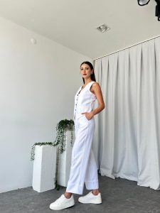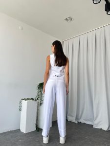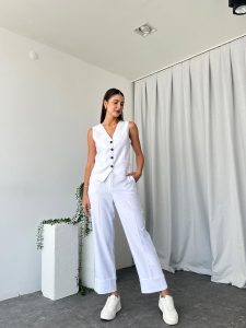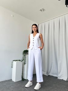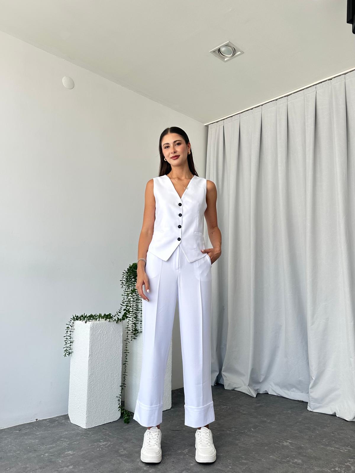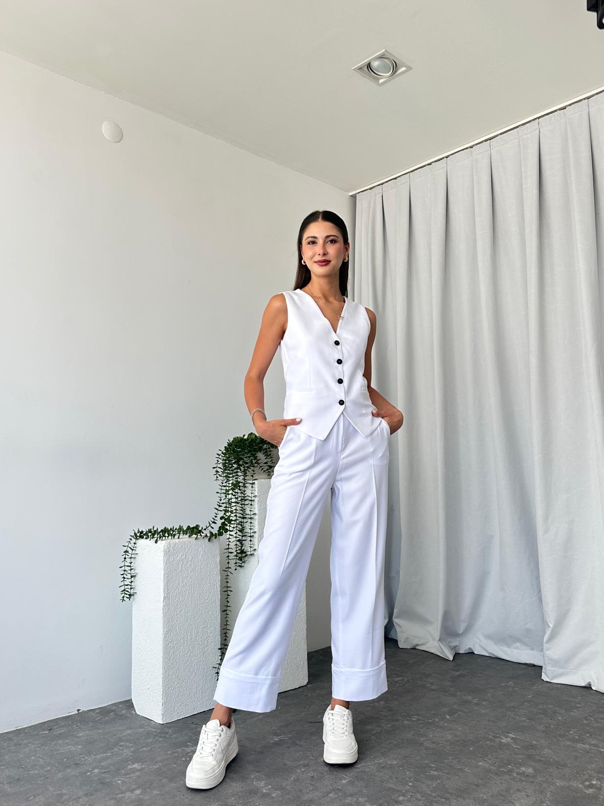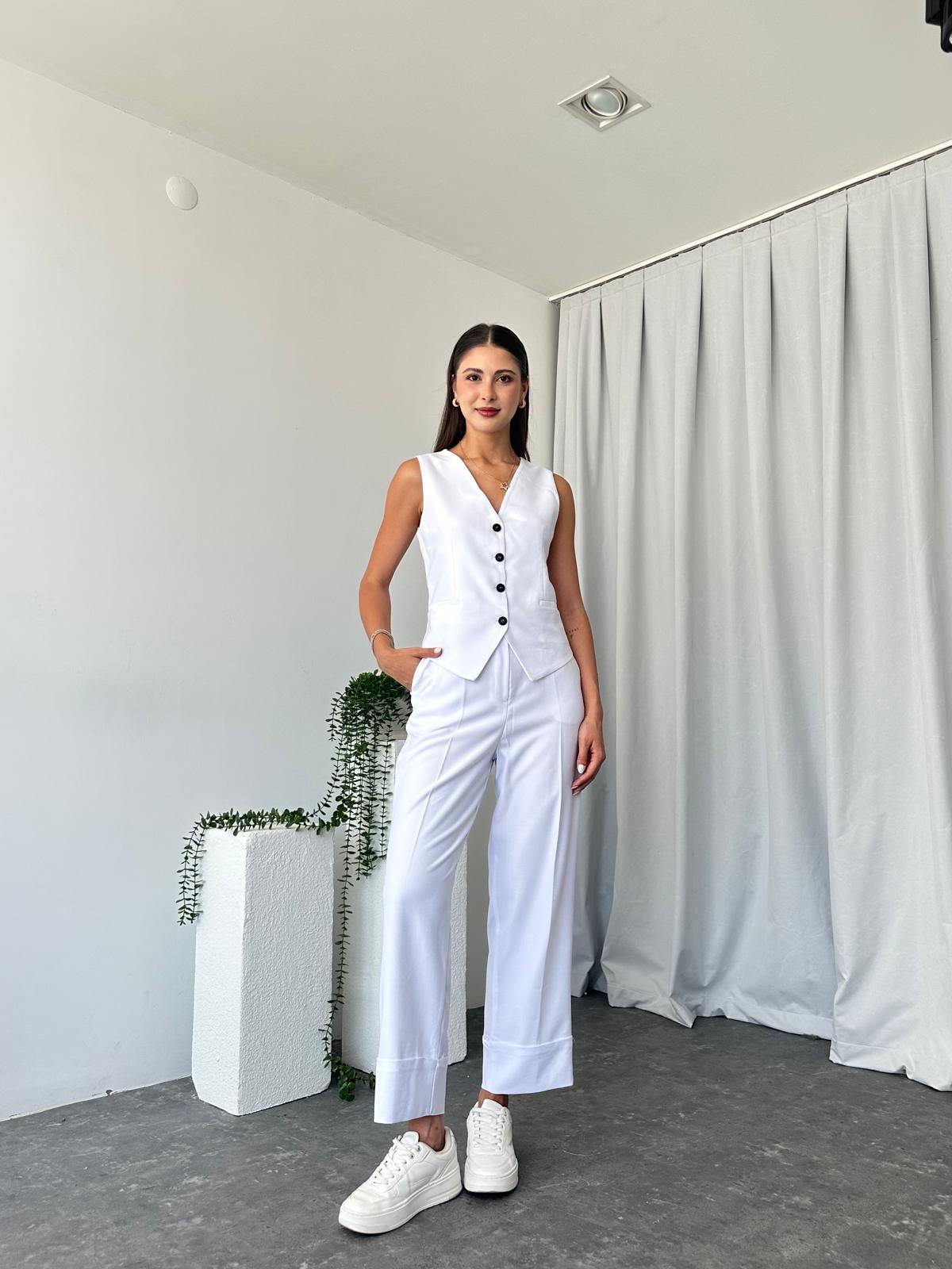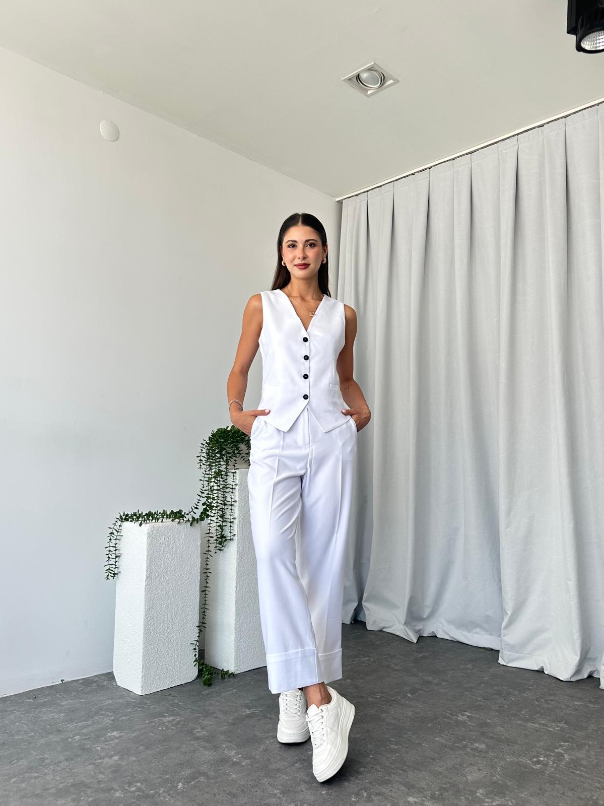 Kadın Beyaz Double Paça Pantalon-Yelek Takım