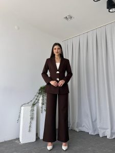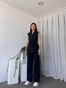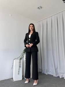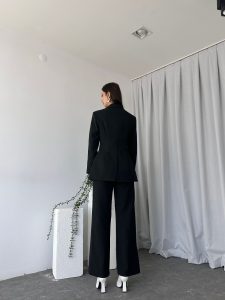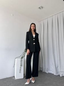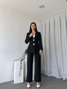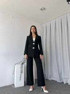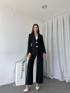 Kadın Düğme Detaylı Siyah Ceket-Pantolon Takım