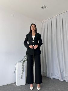 Kadın Düğme Detaylı Siyah Ceket-Pantolon Takım