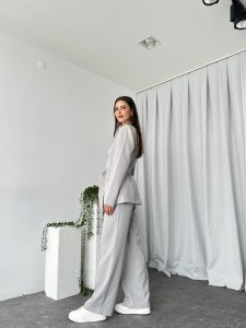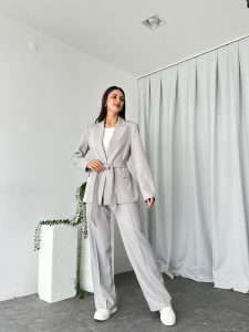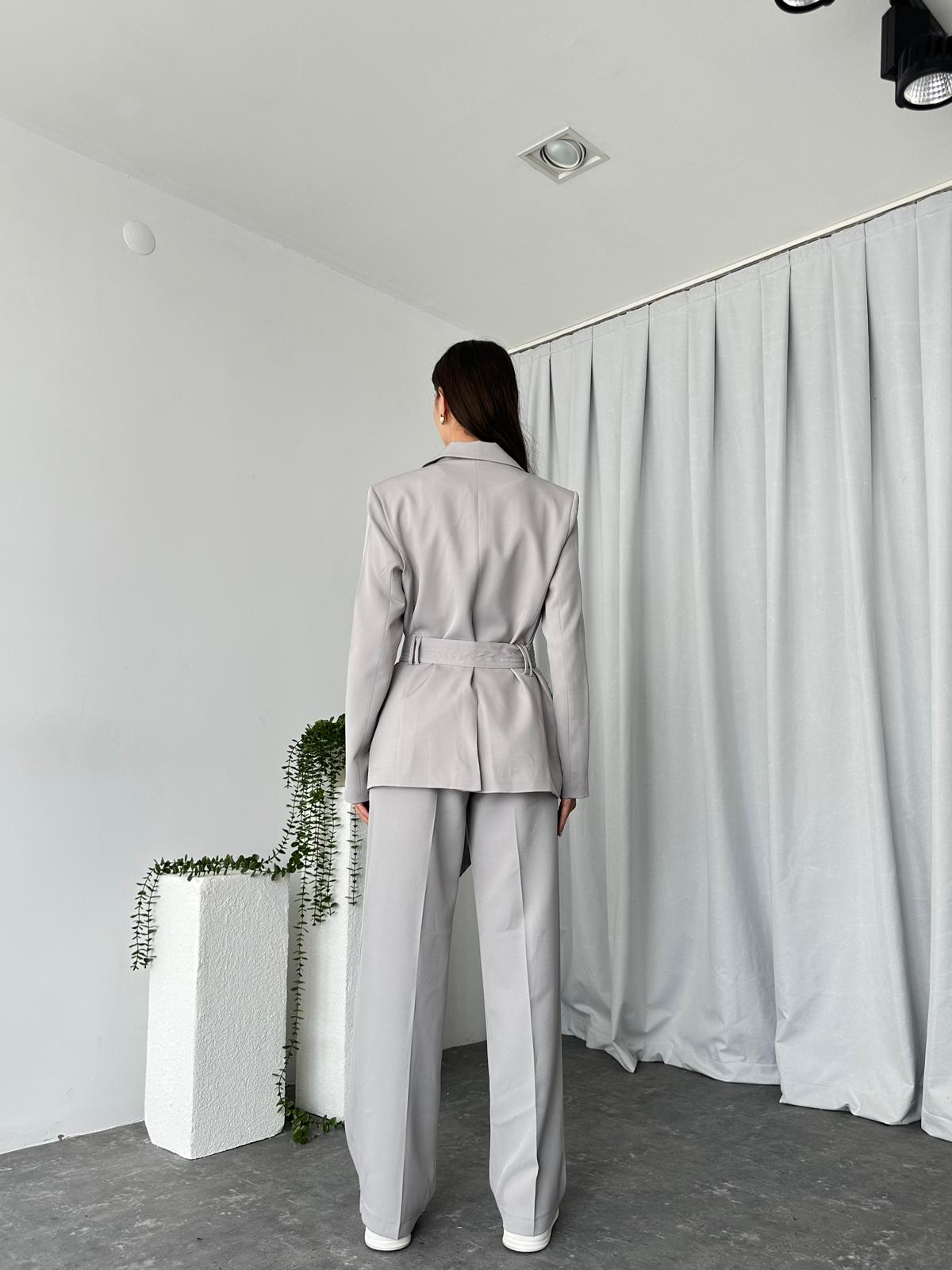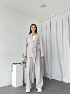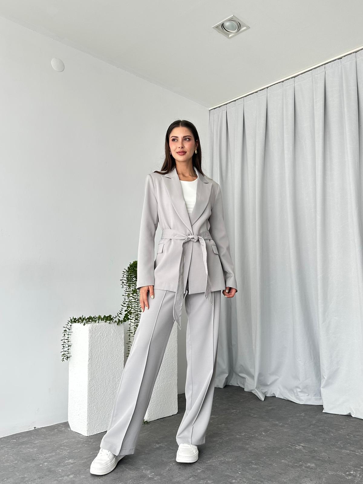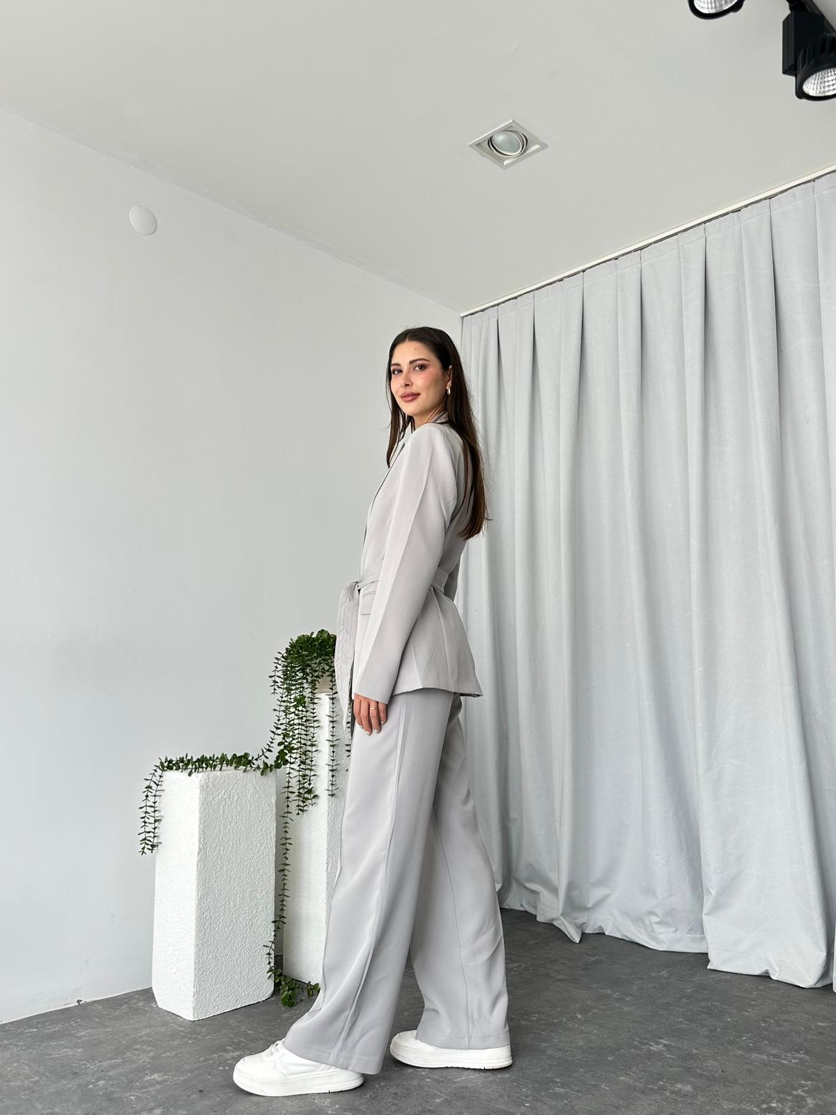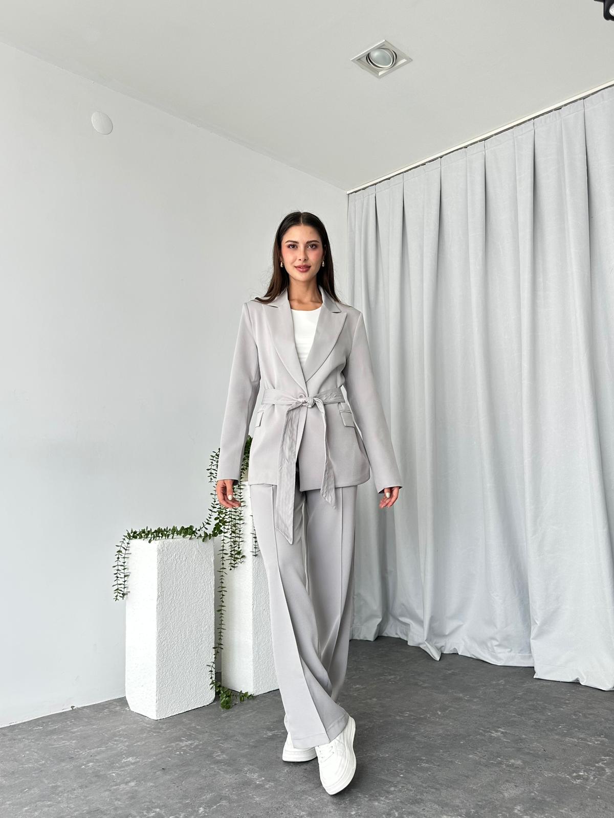 Kadın Gri Kuşaklı Ceket Pantolon Takım