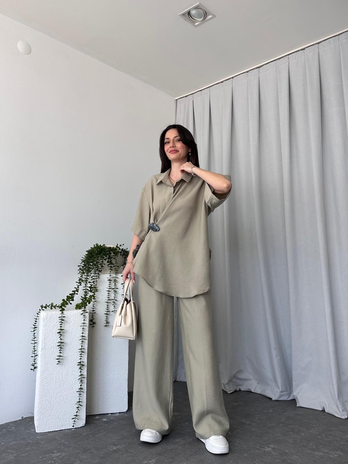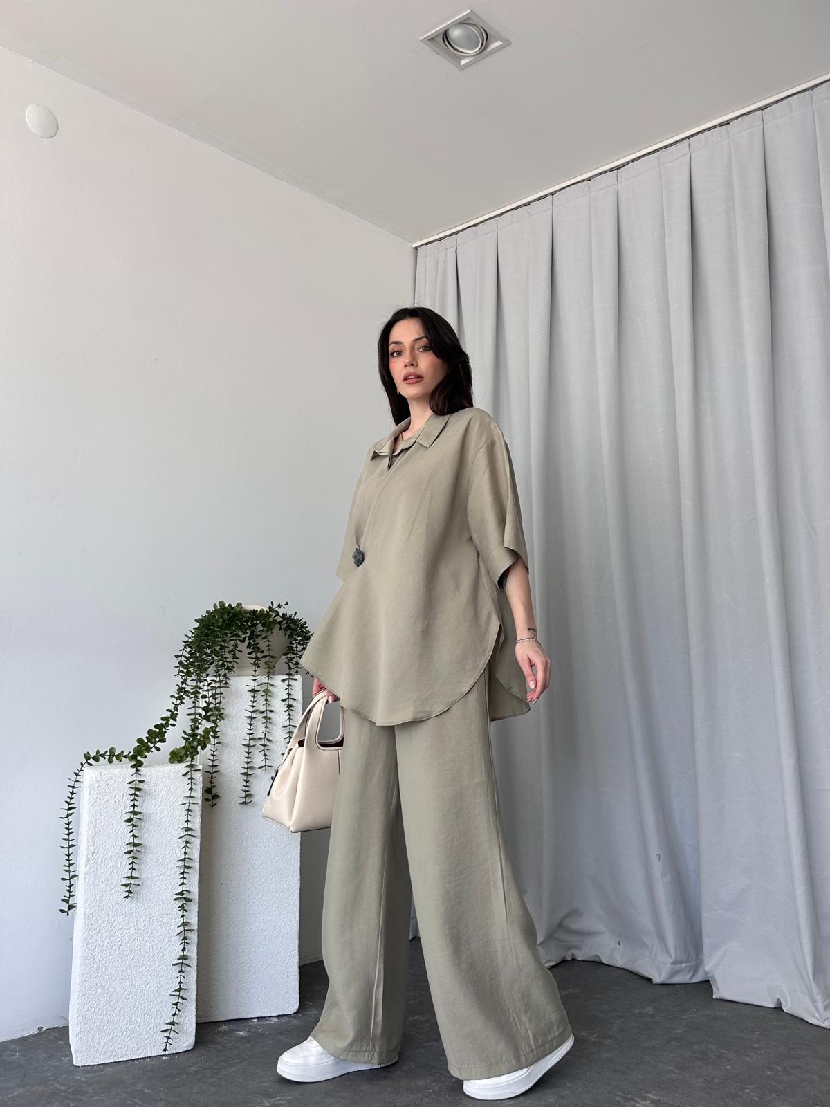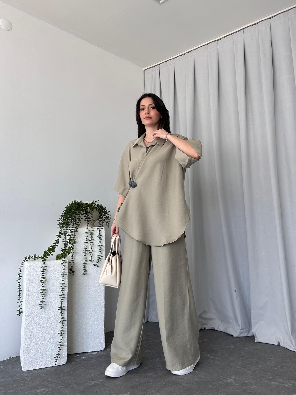 Kadın Haki Rengi Broş Detaylı Gömlek Pantolon Takım