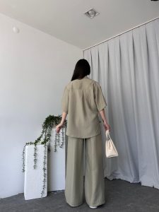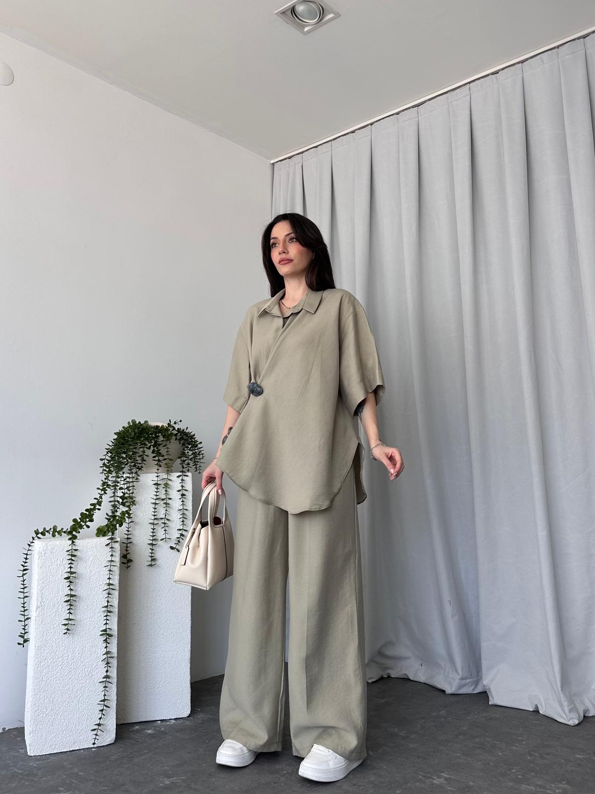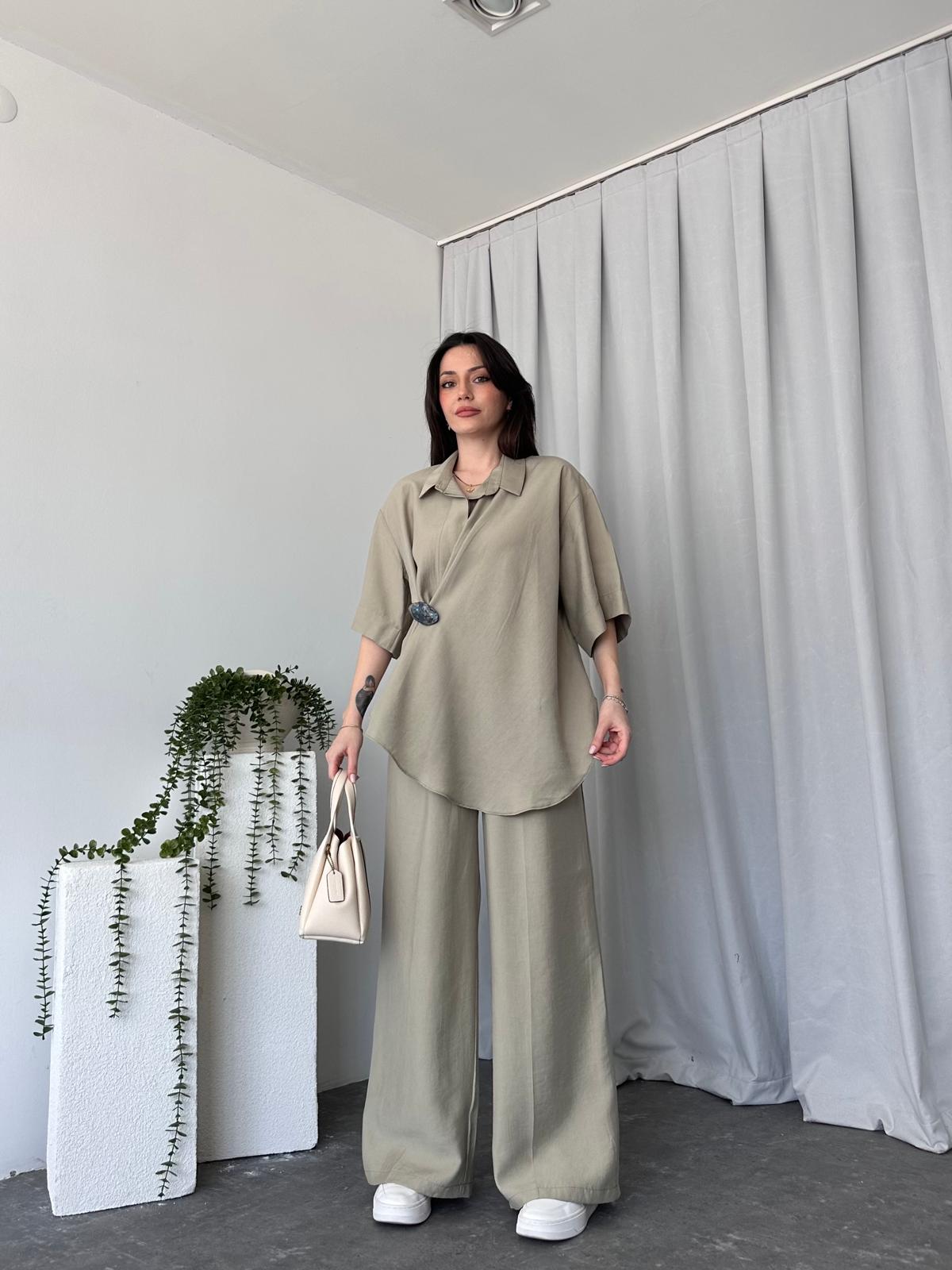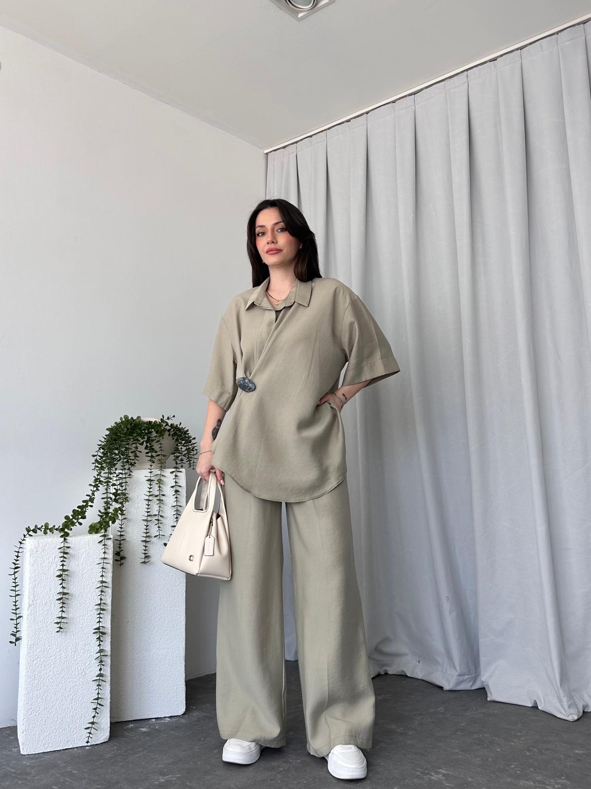 Kadın Haki Rengi Broş Detaylı Gömlek Pantolon Takım