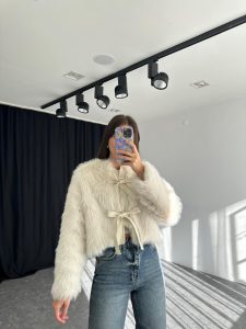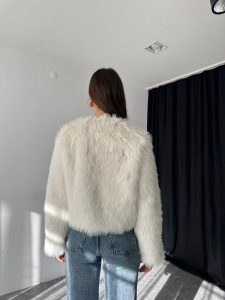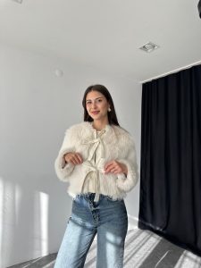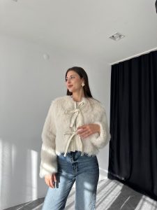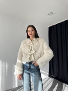 Kadın Krem Deri Fiyonk Detaylı Kürk