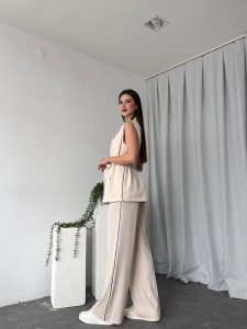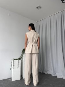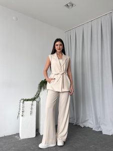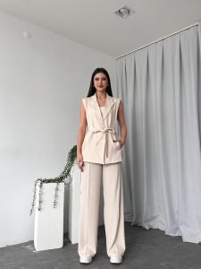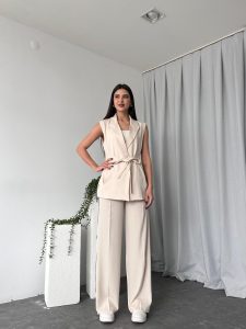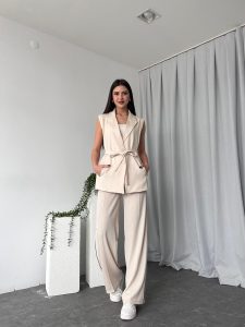 Kadın Krem Uzun Yelekli Takım