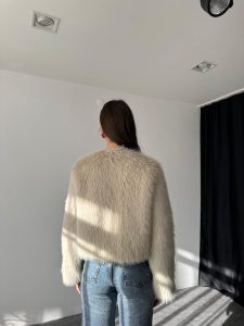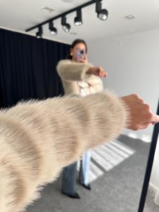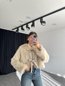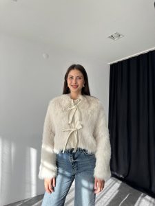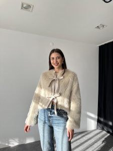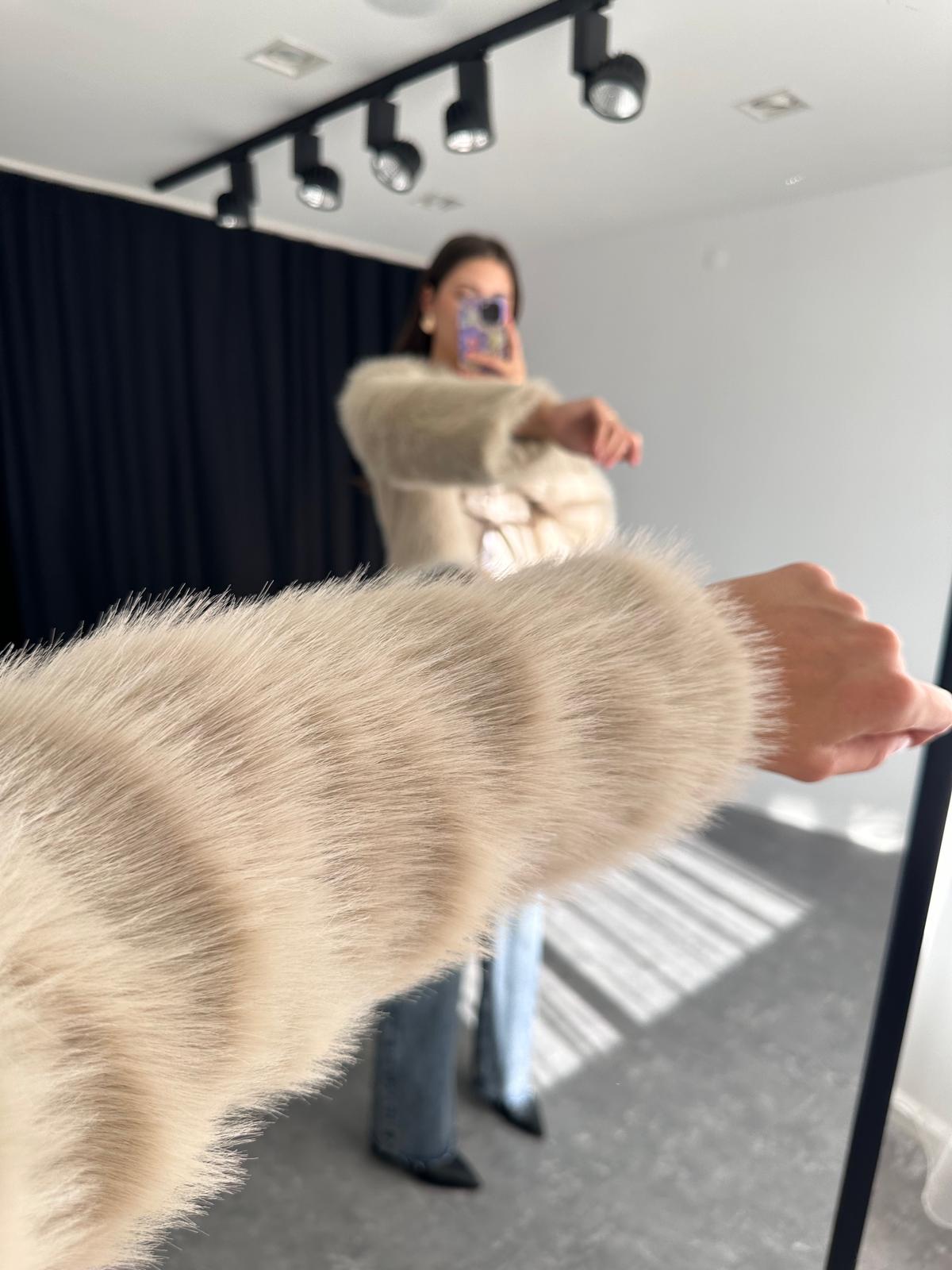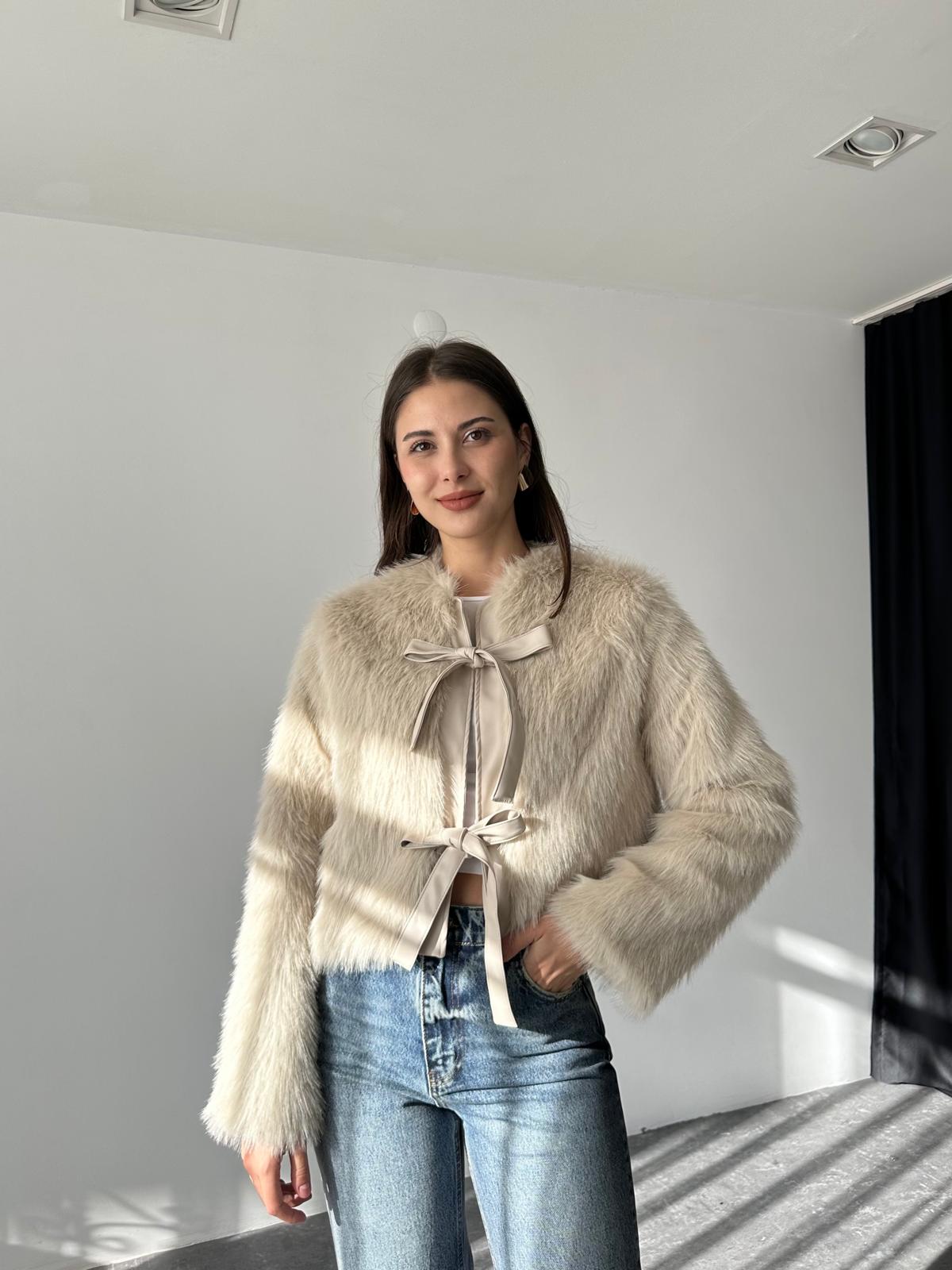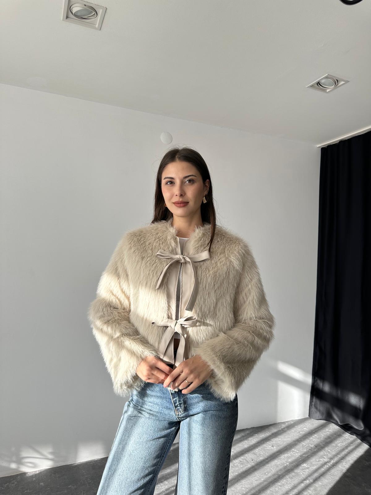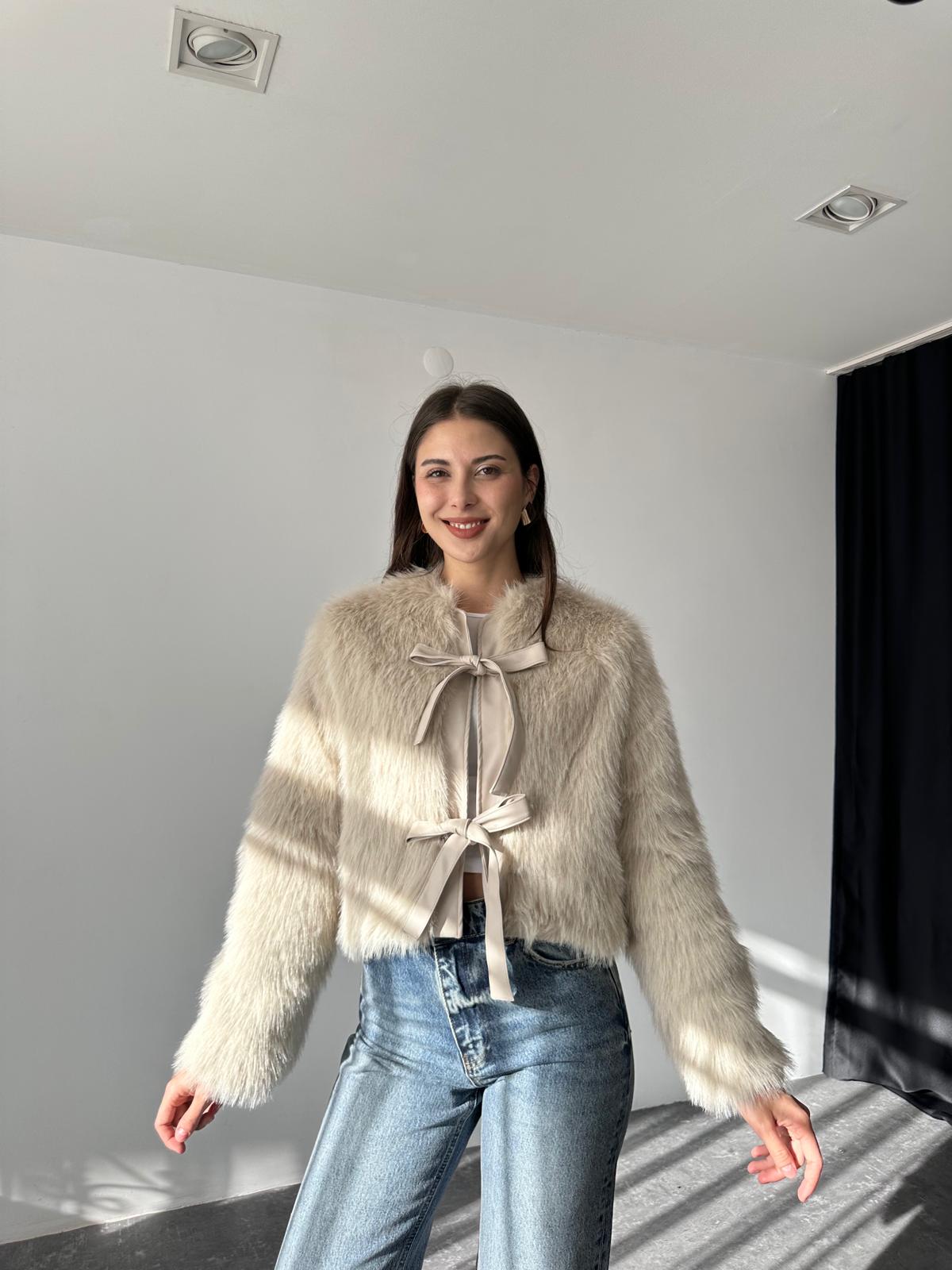 Kadın Taş Rengi Deri Fiyonk Detaylı Kürk