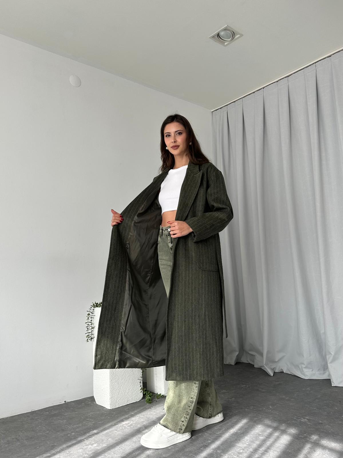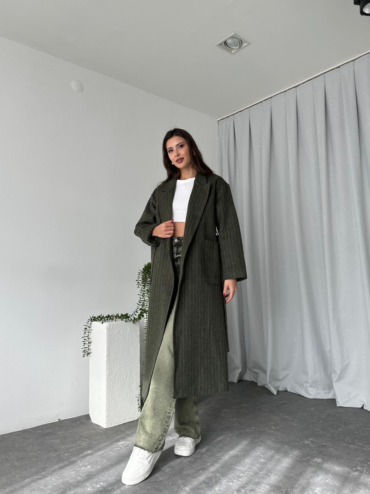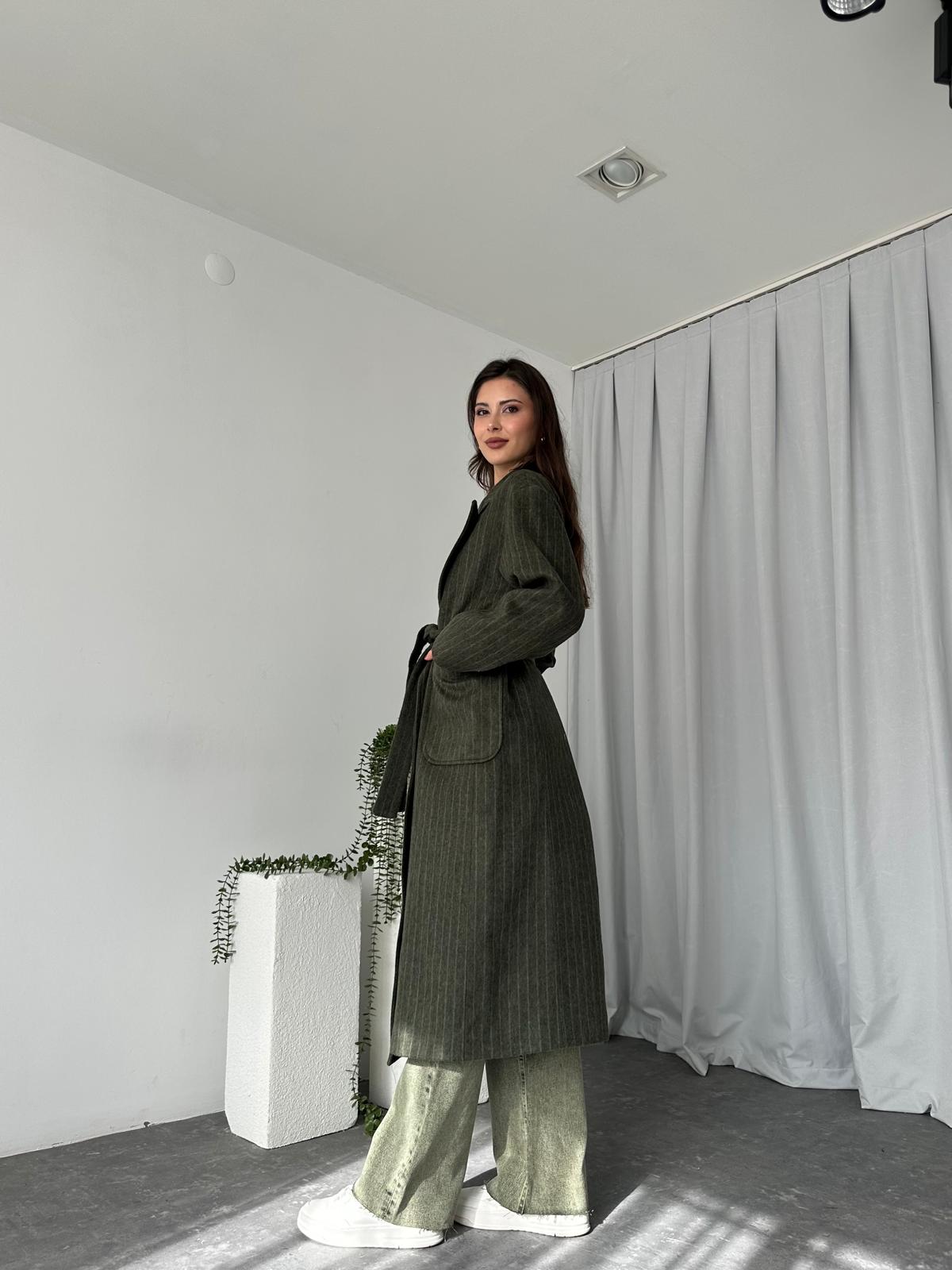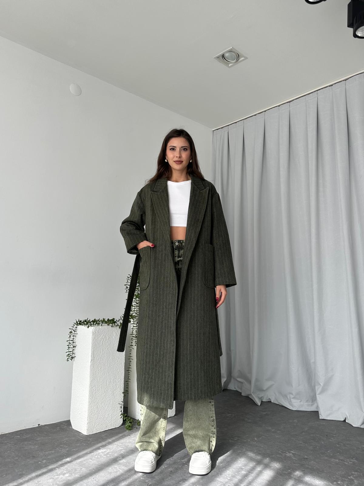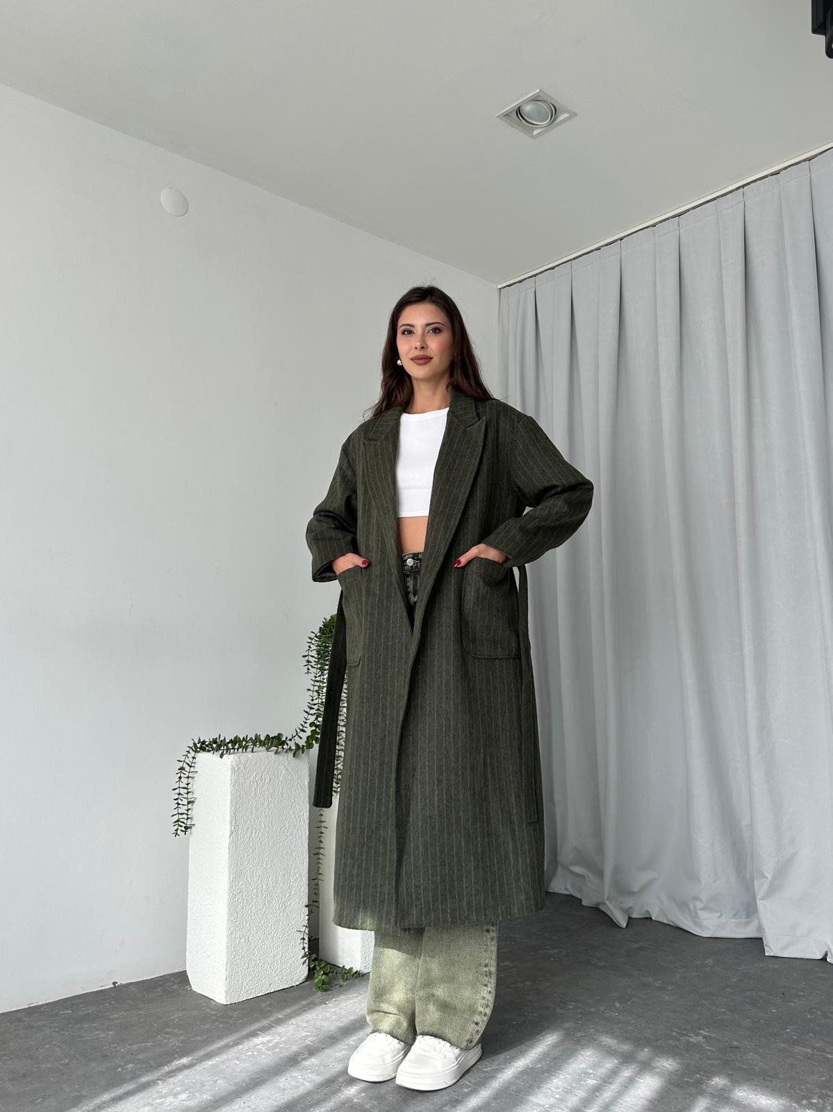 Yün Efekt Çizgili Kaşe Kaban (Haki)