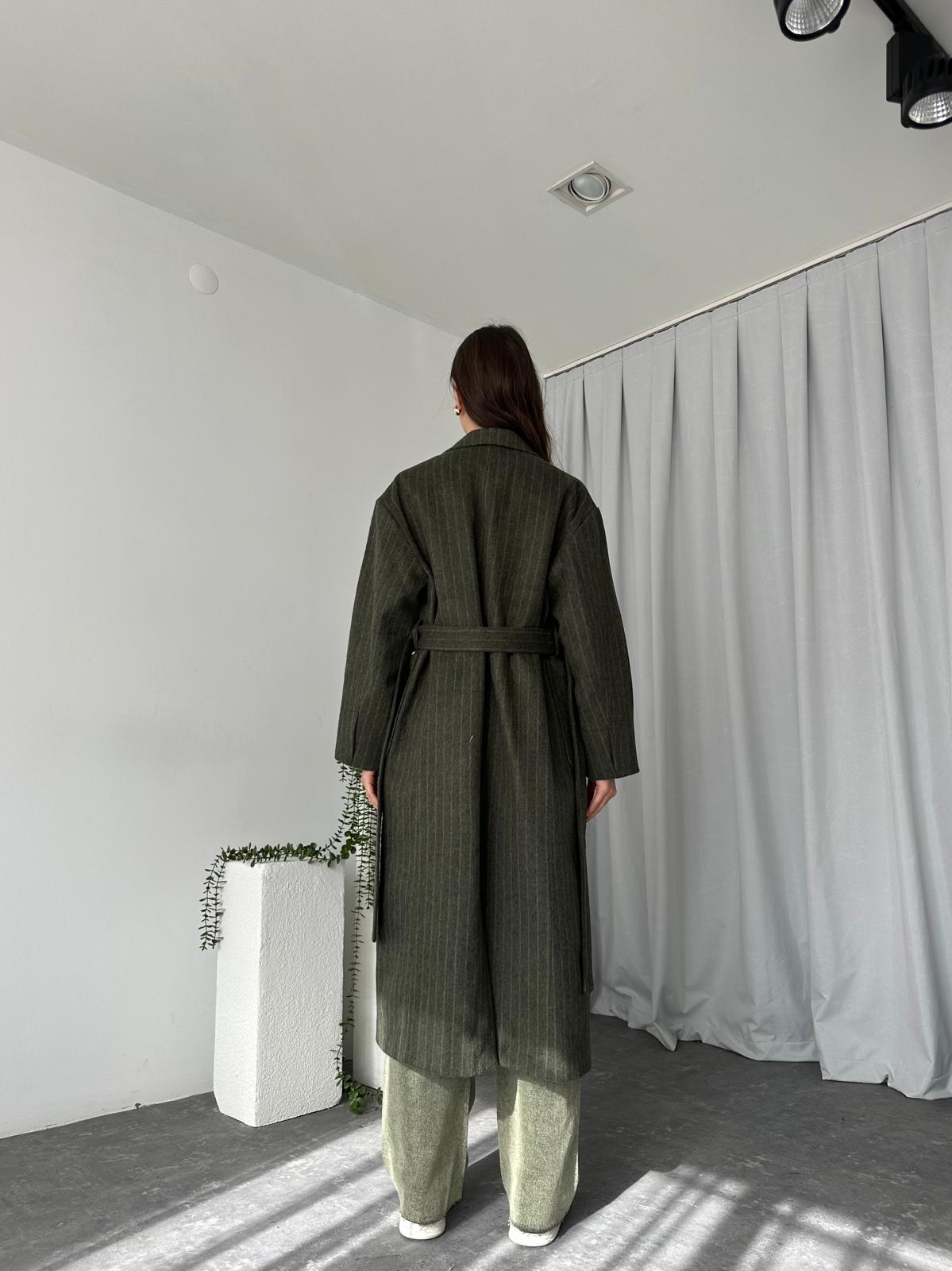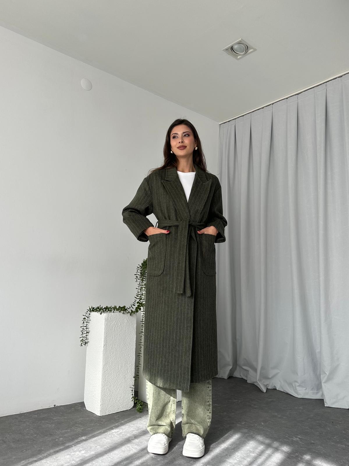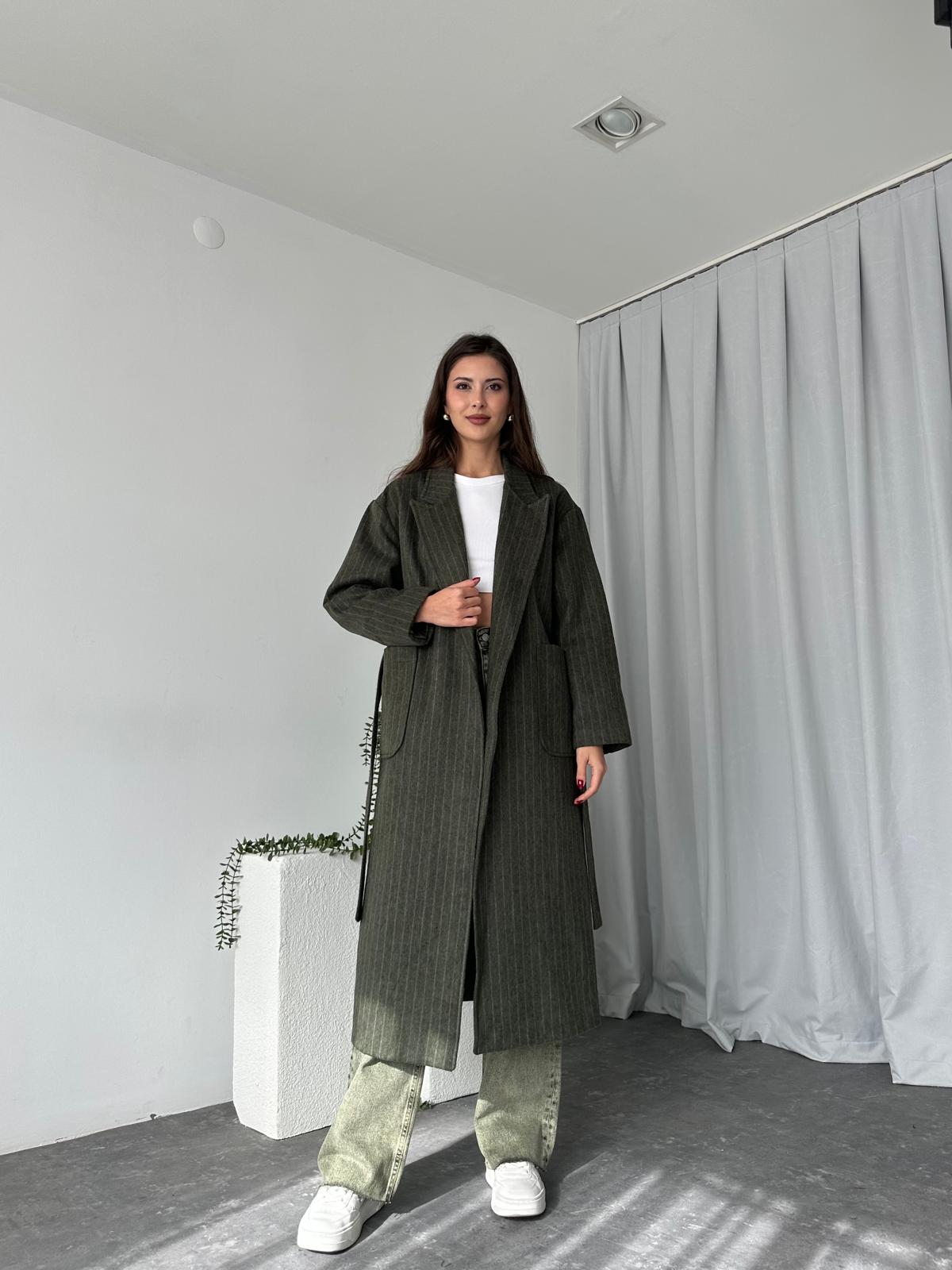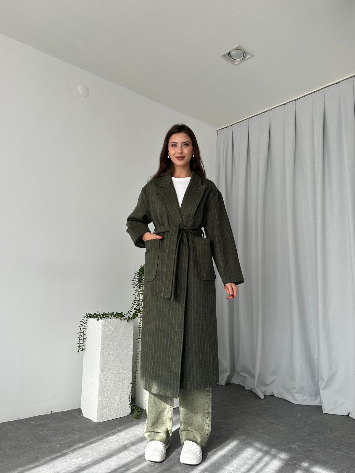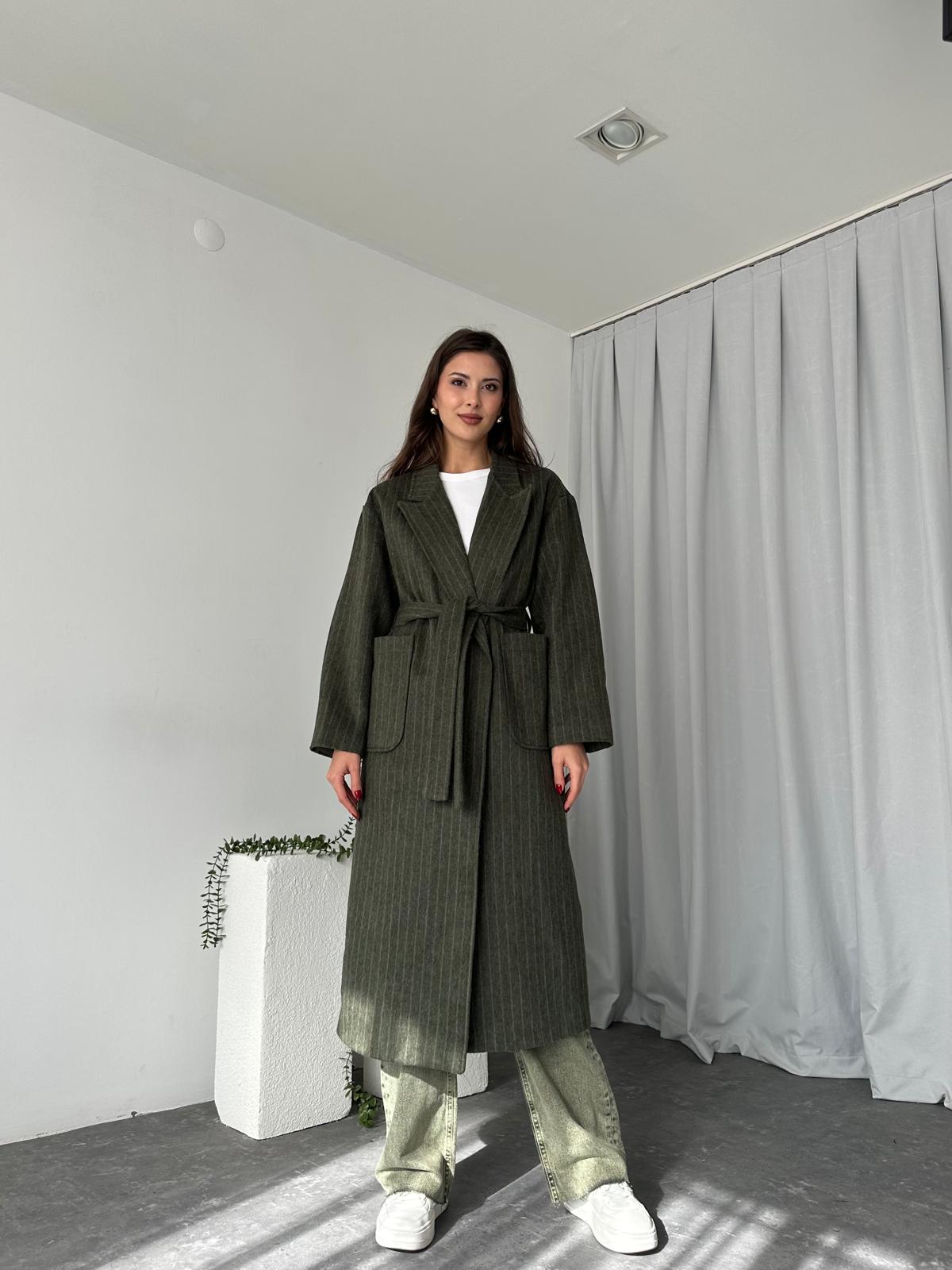 Yün Efekt Çizgili Kaşe Kaban (Haki)