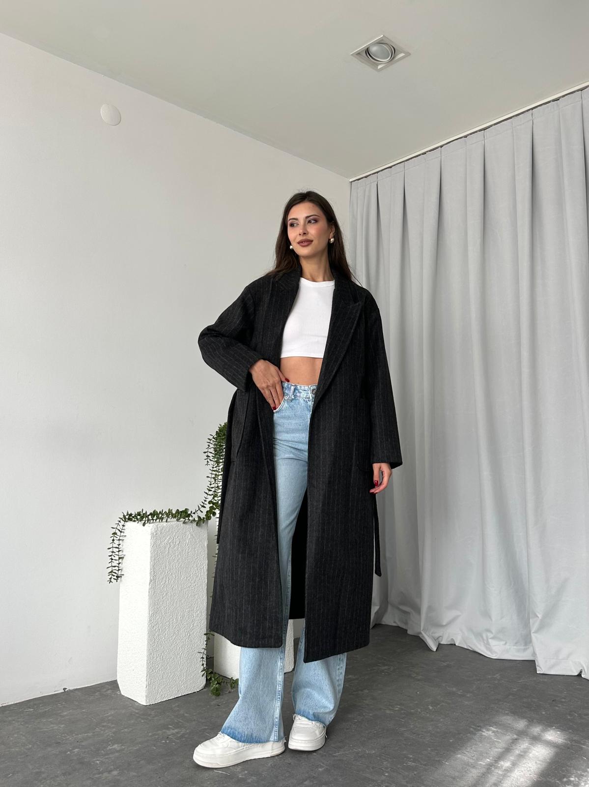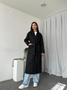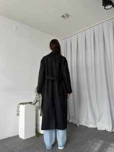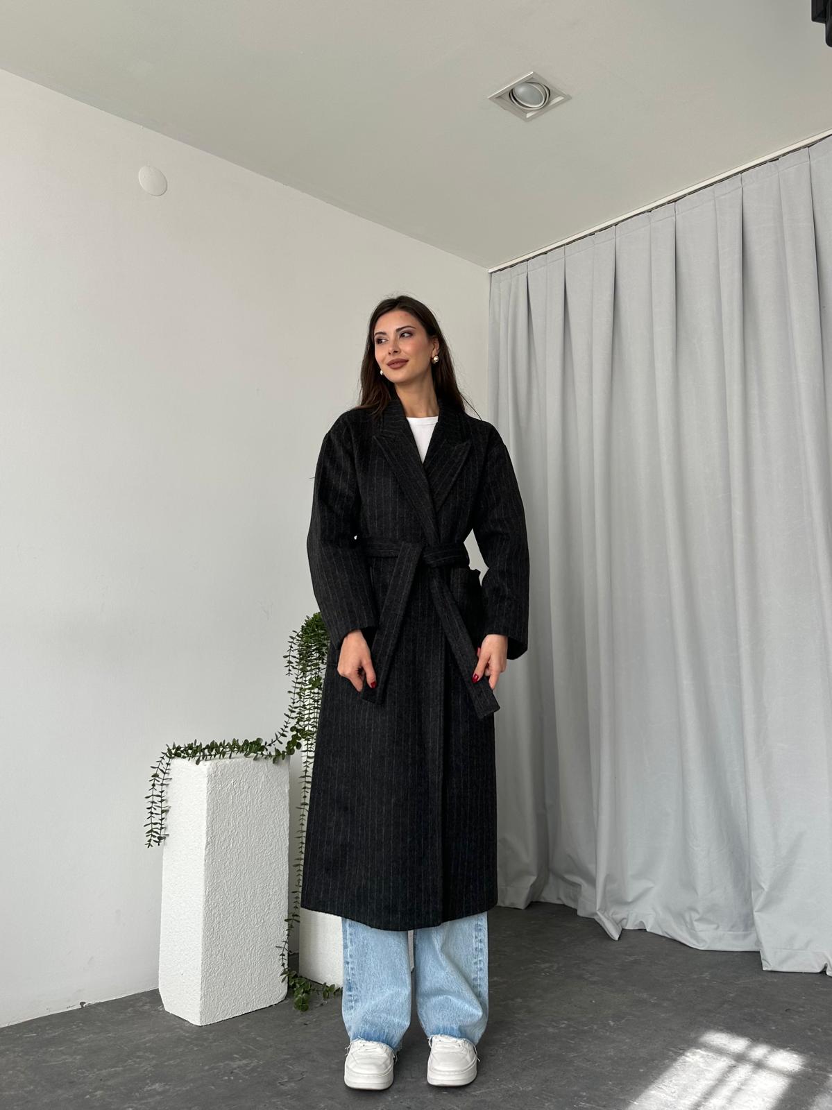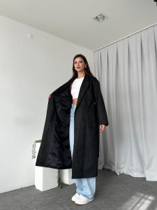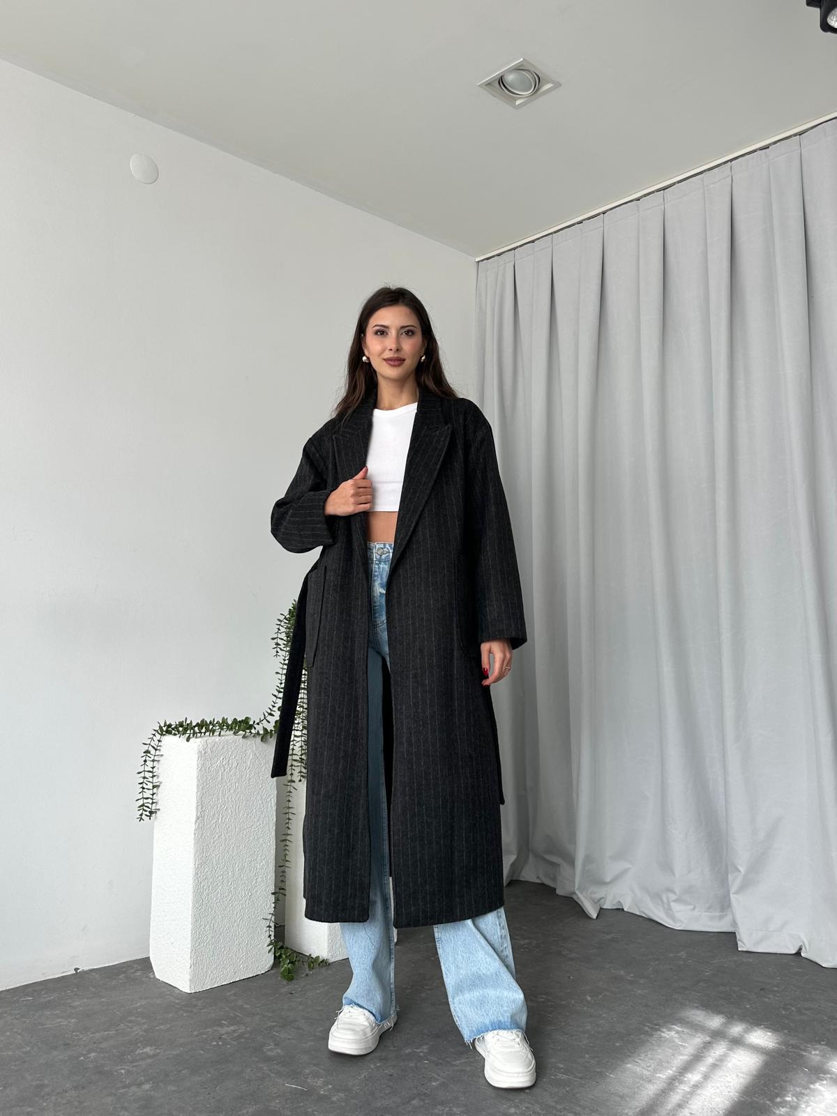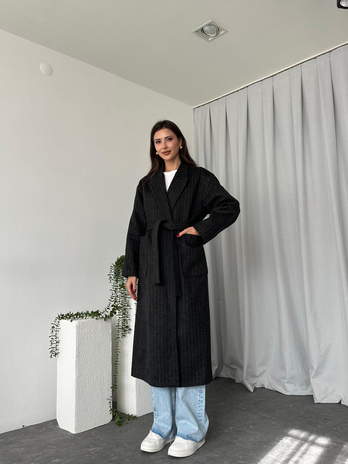 Yün Efekt Çizgili Kaşe Kaban (Siyah)
